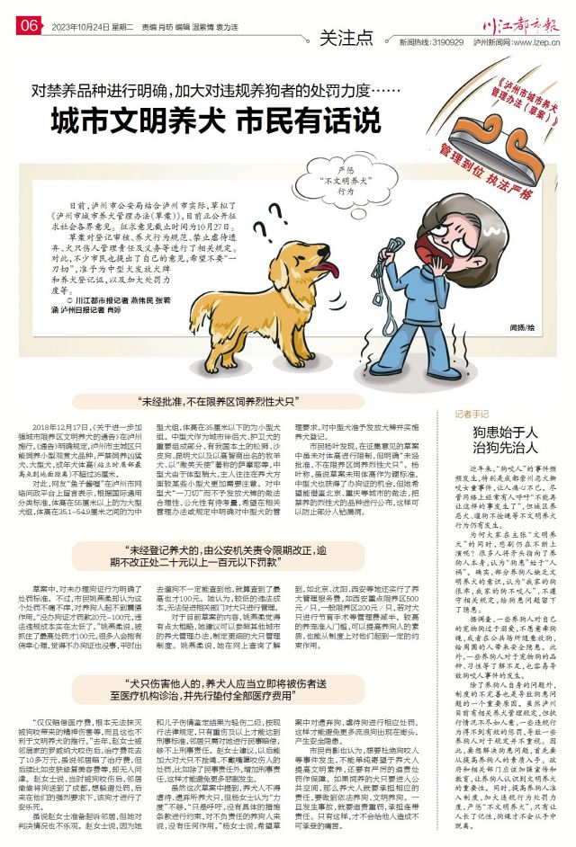 除了养狗人自身的问题外,制度的不完善也是导致狗患问题的一个重要原因。虽然泸州目前有相关养犬管理规定,但执行情况不尽如人意,一些违规行为得不到有效的惩罚,导致一些养狗人对于规定并不重视。因此,要想解决狗患问题,首先要从提高养狗人的素质入手。政府和相关部门应该加强宣传和教育,让养狗人认识到文明养犬的重要性。同时,提高养狗人准入制度,加大违规行为处罚力度,严惩“不文明养犬”,只有让人长了记性,狗绳才不会从手中脱离。