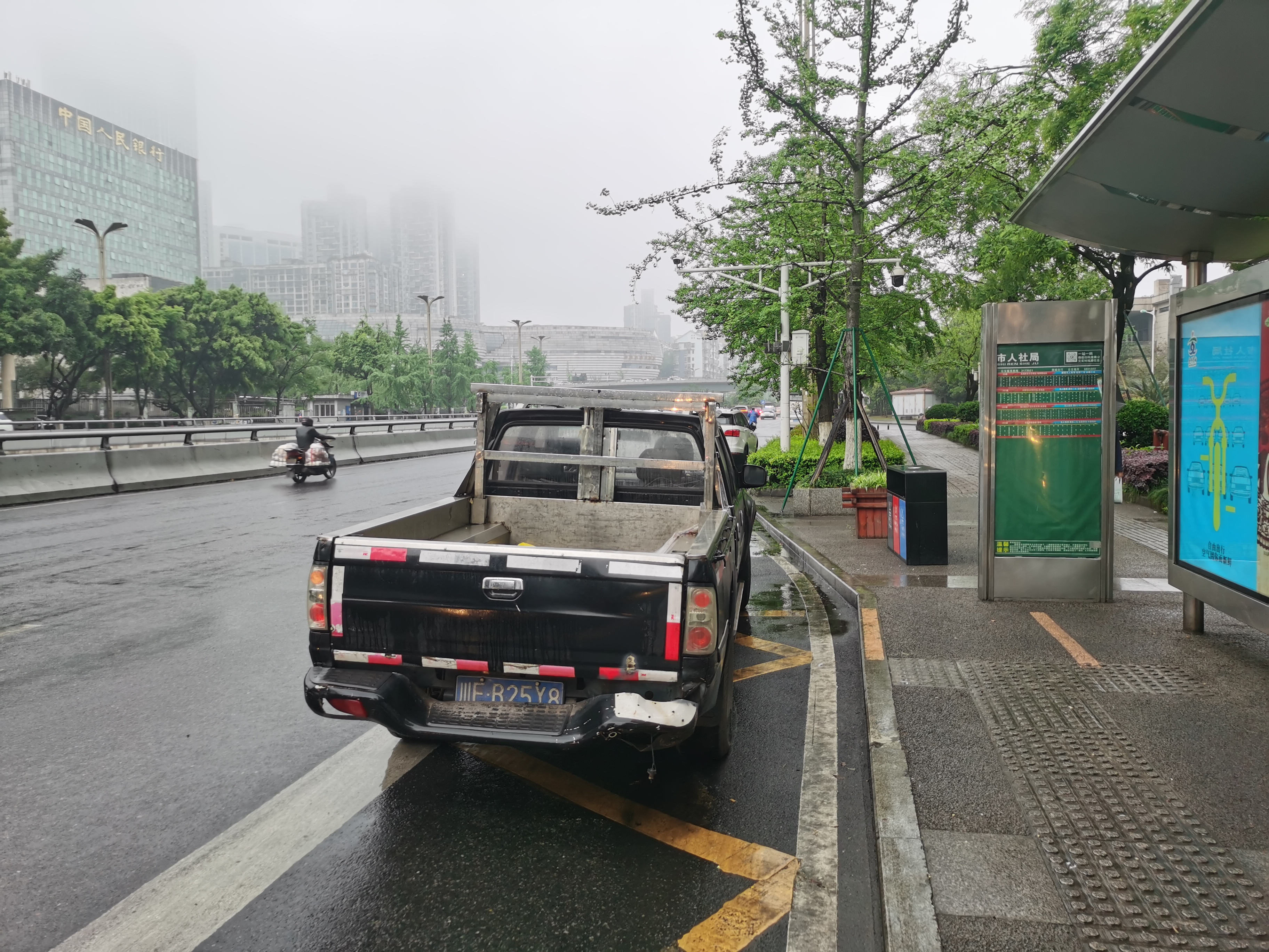 皮卡在市人社局公交站区乱停