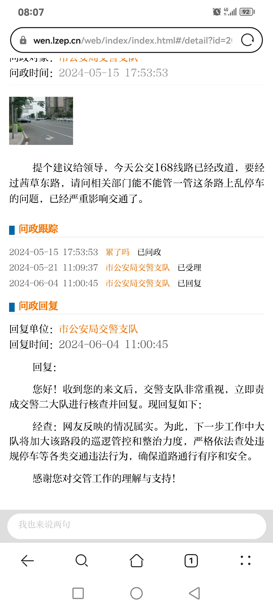 您好!收到您的来文后,交警支队非常重视,立即责成交警二大队进行核查并回复。现回复如下: