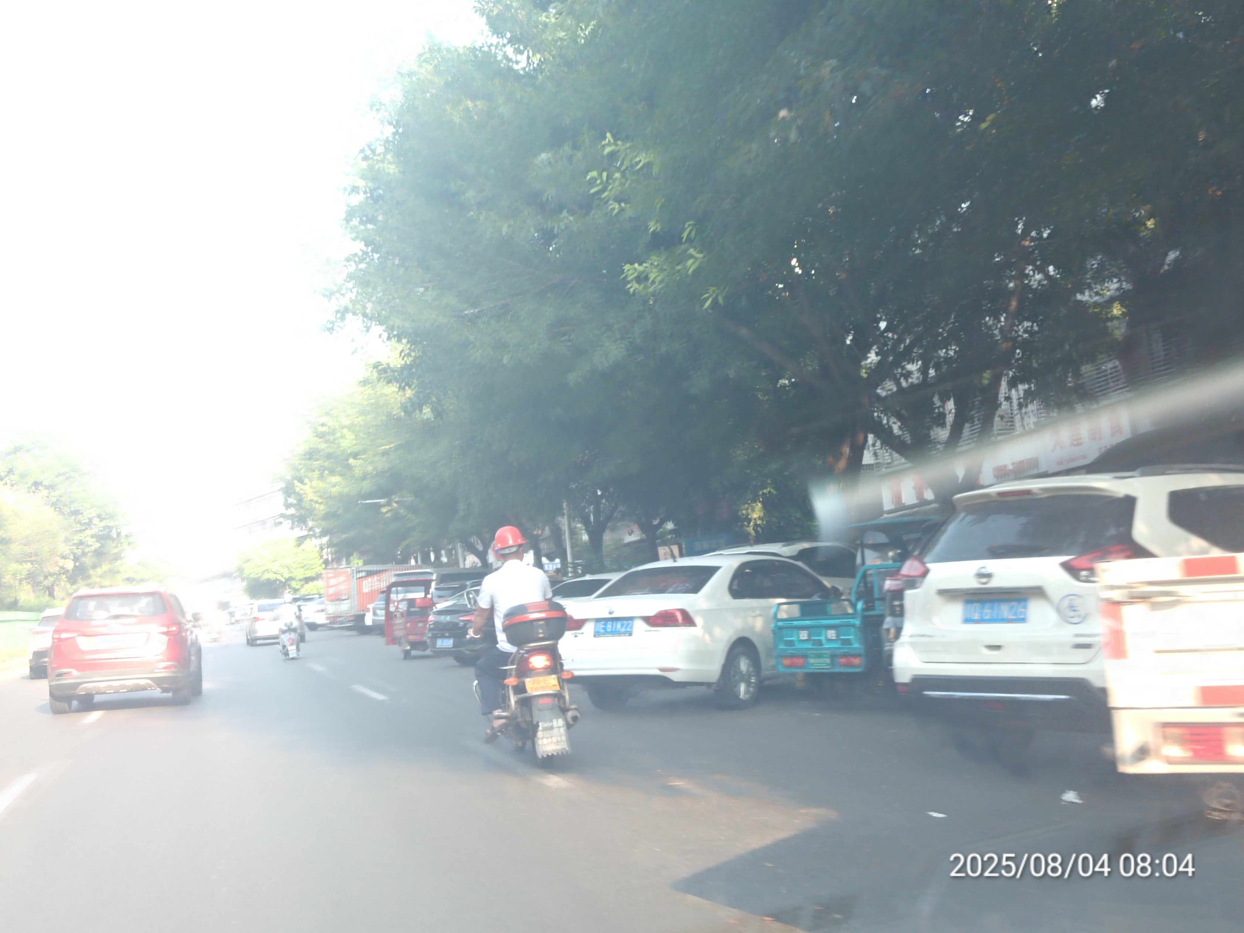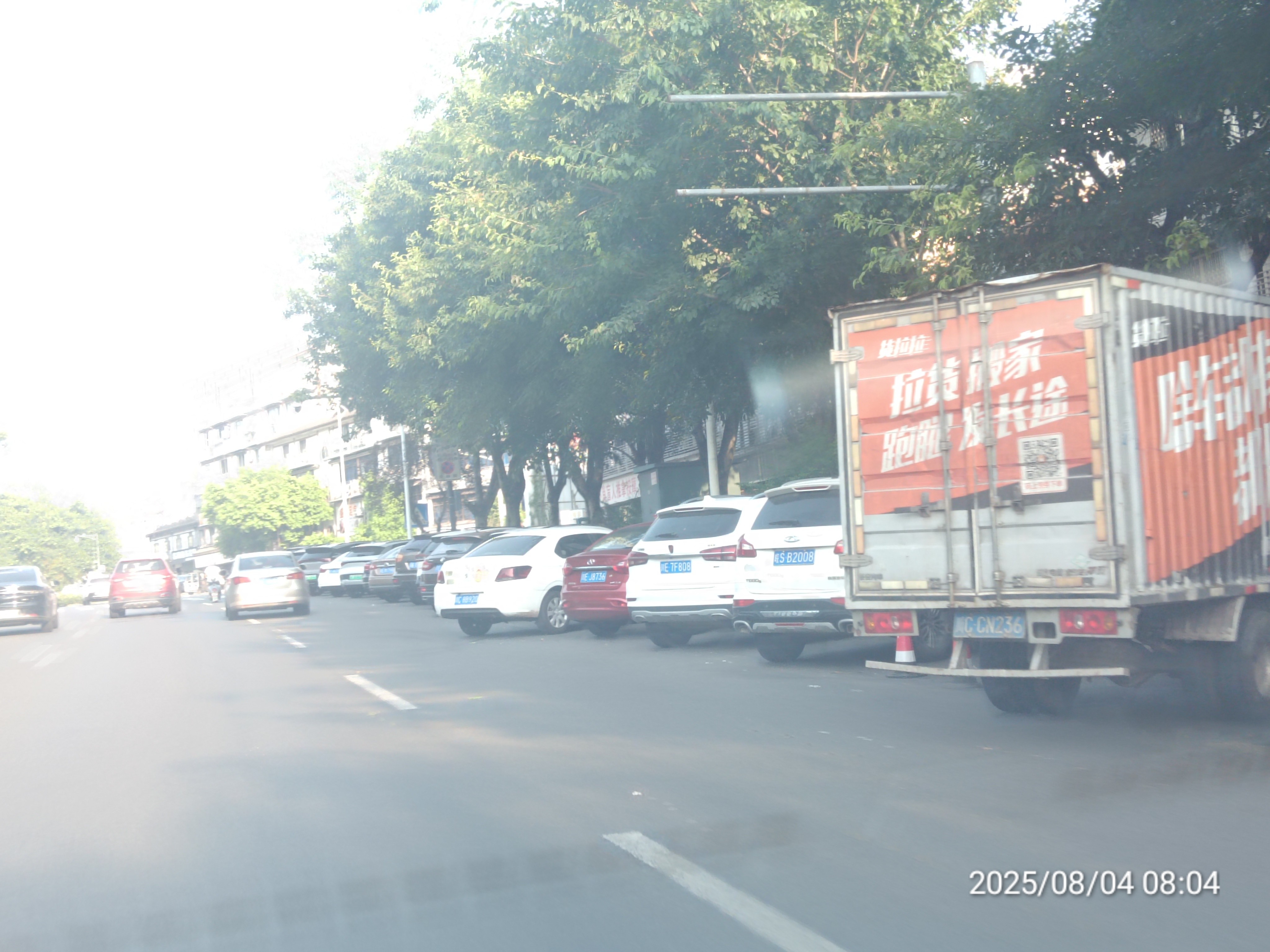 交通隐患行为:违停车辆占用两条车道停车,导致所有机动车和非机动车都挤在最左边两条道路,极容易发生交通事故;