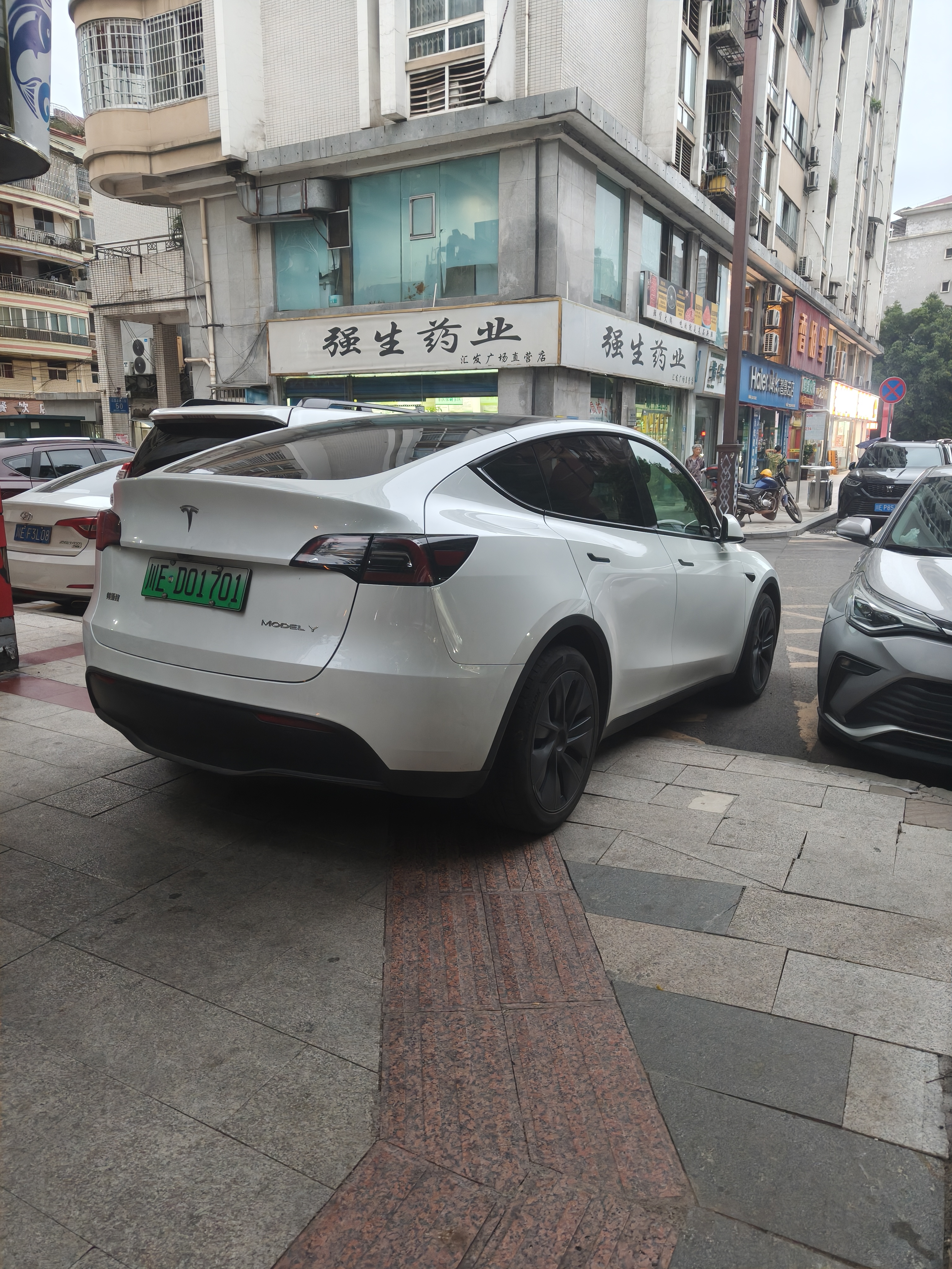 白色特斯拉,占用盲道人行道乱停,严重影响市民通行,推婴儿车的都只能走马路牙抬下去!